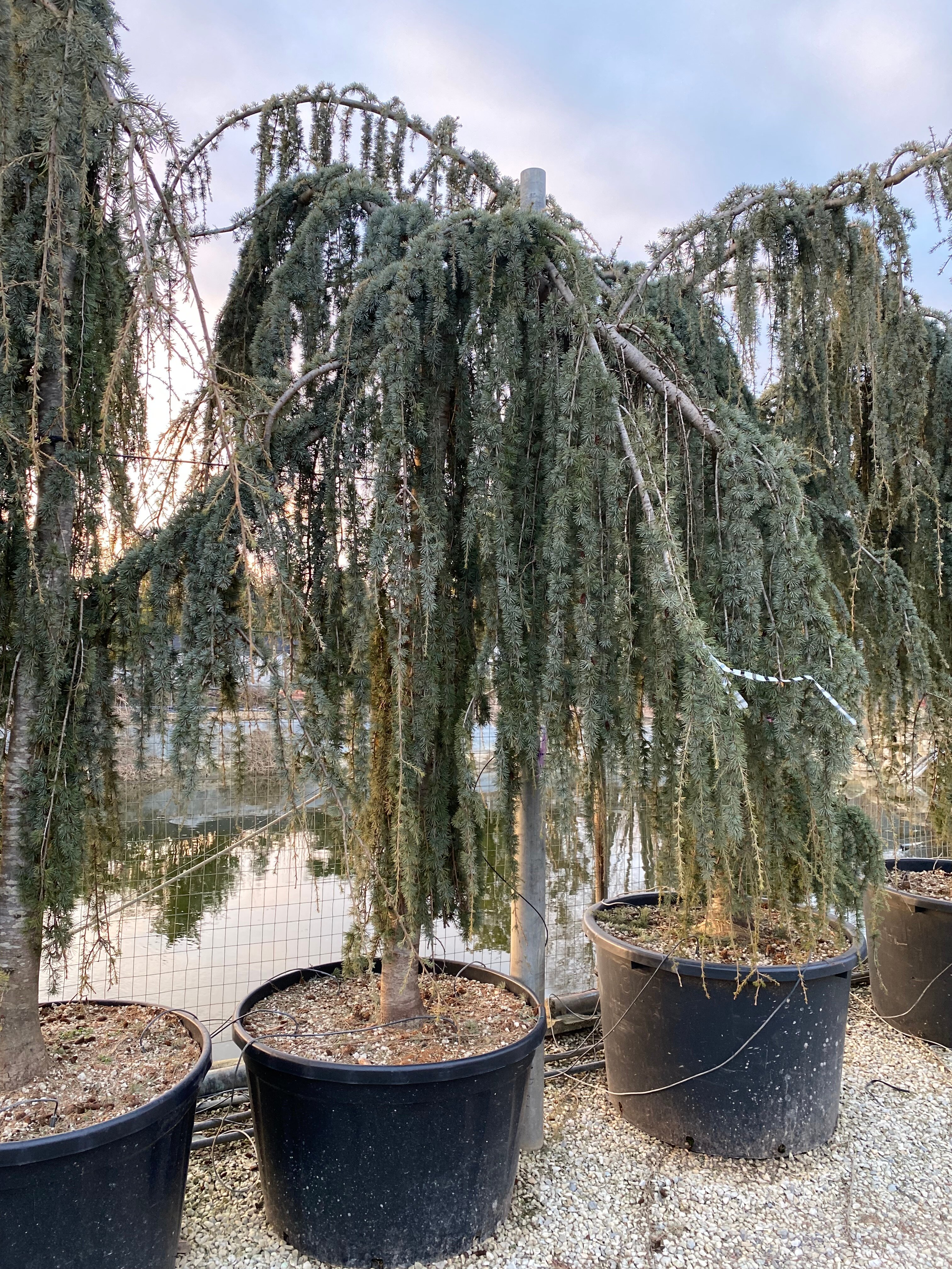 Die Cedrus atlantica ‘Glauca’ – auch Hängende Blauzeder, Blaue Atlaszeder oder Libanon Zeder genannt, ist in dieser Form eine zierliche Trauerzeder mit bizarrer Wuchsform. Der Baum hat einen schwarz-grauen Stamm und stark hängende Zweige. Die die Rinde des Stamms ist anfangs glatt und wird mit zunehmendem Alter rauer sein. Die jüngeren Zweige der Blauzeder sind glatt, haben eine gräuliche Farbe und sind leicht behaart. Die Blaue Atlaszeder trägt silberblaue Nadeln, die in Büscheln von 20-40 Stück beieinander stehen. Die Trauerzeder behält auch im Winter seine Nadeln und seine Färbung. Zum Herbst hin erscheinen braune, stehende Zapfen am Baum. Die bizarre Wuchsform der Hängenden Blauzeder wird durch das undurchdringbare, stachelige Äußere der Nadeln des Cedrus noch mehr verstärkt. Trauer- bzw. Hängebäume werden als auffällige Solitärbäume gepflanzt, können aber auch an einem Teichrand wunderschön zur Geltung kommen.